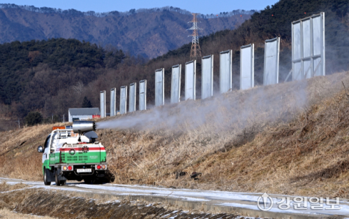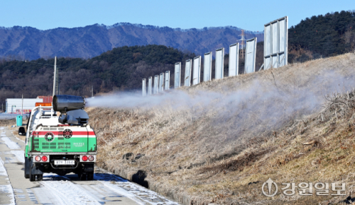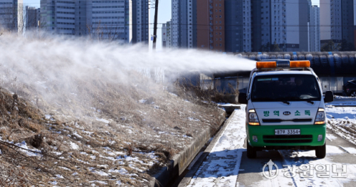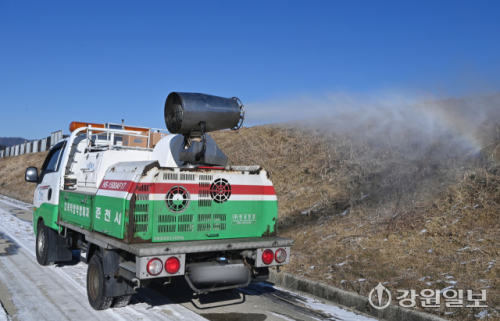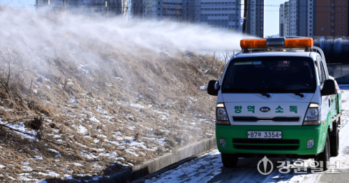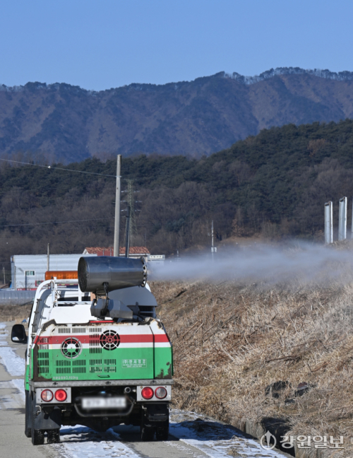 최근 원주에서 발견된 야생조류 폐사체에서 고병원성 조류인플루엔자(AI) 바이러스가 확인된 가운데 도내 지자체들이 겨울철 조류독감 차단 방역을 강화하고 있다. 22일 춘천시 축산과 방역차량이 철새도래지인 우두온수지 일대에 방역활동을 벌이고 있다.
