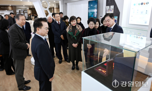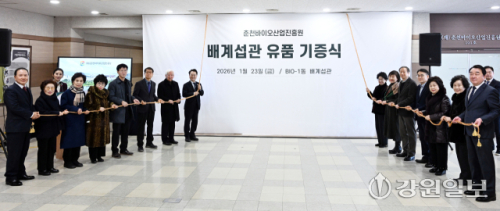 춘천바이오산업진흥원 '배계섭관 유품 기증식'이 23일 원내에서 고(故) 배계섭 전 춘천시장의 부인 이매자 여사와 신용철 전 춘천부시장 부인 윤강규 여사, 육동한 시장, 김창혁 원장을 비롯한 내빈들이 참석한 가운데 열렸다.