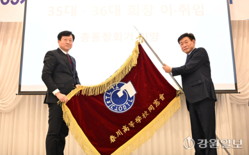 춘천고 총동창회 2026년 제69차 정기총회 및 회장 이·취임식이 24일 춘천 세종호텔에서 김경수 이임회장, 유도현 신임회장을 비롯한 동문과 이상철 교장, 김진태 지사, 신경호 교육감, 육동한 시장 및 내빈들이 참석한 가운데 열렸다. 신세희기자24일 춘천 세종호텔에서 열린 춘천고 총동창회 2026년 제69차 정기총회 및 회장 이·취임식에서 김경수 이임회장(오른쪽)이 유도현 신임회장에게 총동창회기를 이양하고 있다. 신세희기자유도현 신임회장이 24일 춘천 세종호텔에서 열린 춘천고 총동창회 2026년 제69차 정기총회 및 회장 이·취임식에서 취임사하고 있다. 신세희기자춘천고 총동창회가 24일 세종호텔에서 제69차 정기총회를 열고 재단법인 상록글로벌미래재단 설립을 위한 발기인을 소개하고 있다. 발기인은 김경수 호반의료재단 이사장 및 춘천고동창회관 건립추진위원장(49회), 신용준 춘천미래동행재단 이사장(44회), 육동한 춘천시장(50회), 정수복 윤서병원 병원장(52회), 유도현 유성농원 대표 및 춘천고 총동창회 36대 회장(56회), 김희철 강원도의원, 최대식 스카이컨벤션웨딩홀 대표다. 신세희기자