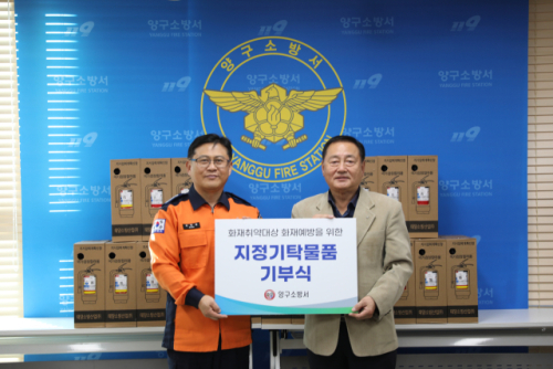 양구소방서(서장:권혁범)는 19일 서내 소회의실에서 화재취약대상 화재예방을 위한 지정기탁물품 기부식 행사를 열었다. 이번 행사에서는 양구군농협(조합장:박성용)이 소화기 60개를 전달했으며, 기부 물품은 화재취약대상에 순차적으로 보급될 예정이다.양구소방서(서장:권혁범)는 19일 서내 소회의실에서 화재취약대상 화재예방을 위한 지정기탁물품 기부식 행사를 열었다. 이번 행사에서는 양구군농협(조합장:박성용)이 소화기 60개를 전달했으며, 기부 물품은 화재취약대상에 순차적으로 보급될 예정이다.